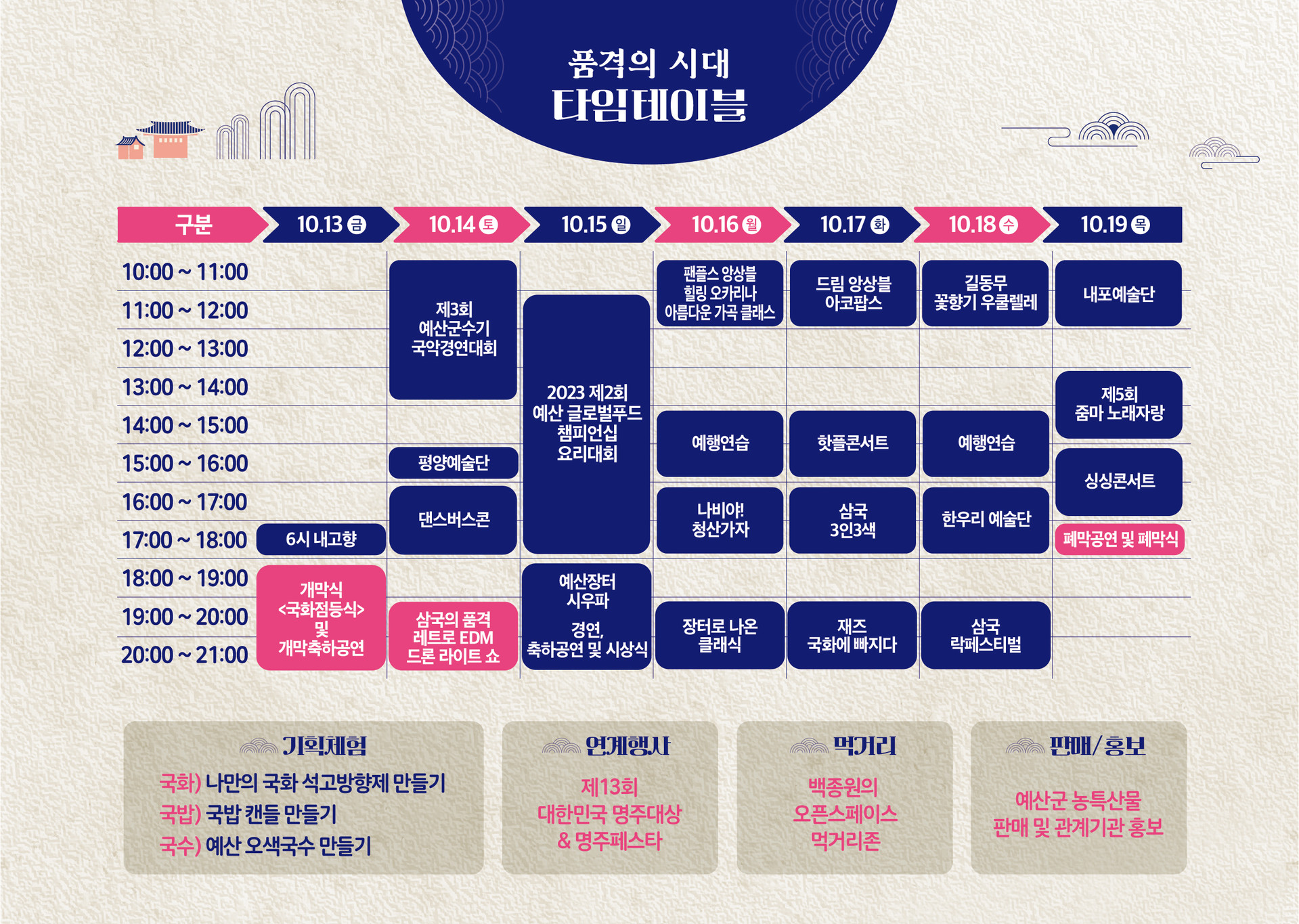 - 행사 내용 : 국화전시, 삼국의 품격 콘서트, 시우파(시장우먼파이터), 백종원의 오픈스페이스 먹거리존, 예산글로벌푸드 챔피언십 요리대회 등